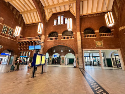 Een mooi stationsgebouw. Verder de nodige faciliteiten zoals winkels, horeca en kaartverkoop. Geen poortjes om te openen maar openstaande doorgangen. Naast doorgaande sporen ook een paar eindsporen. Verder een net station.